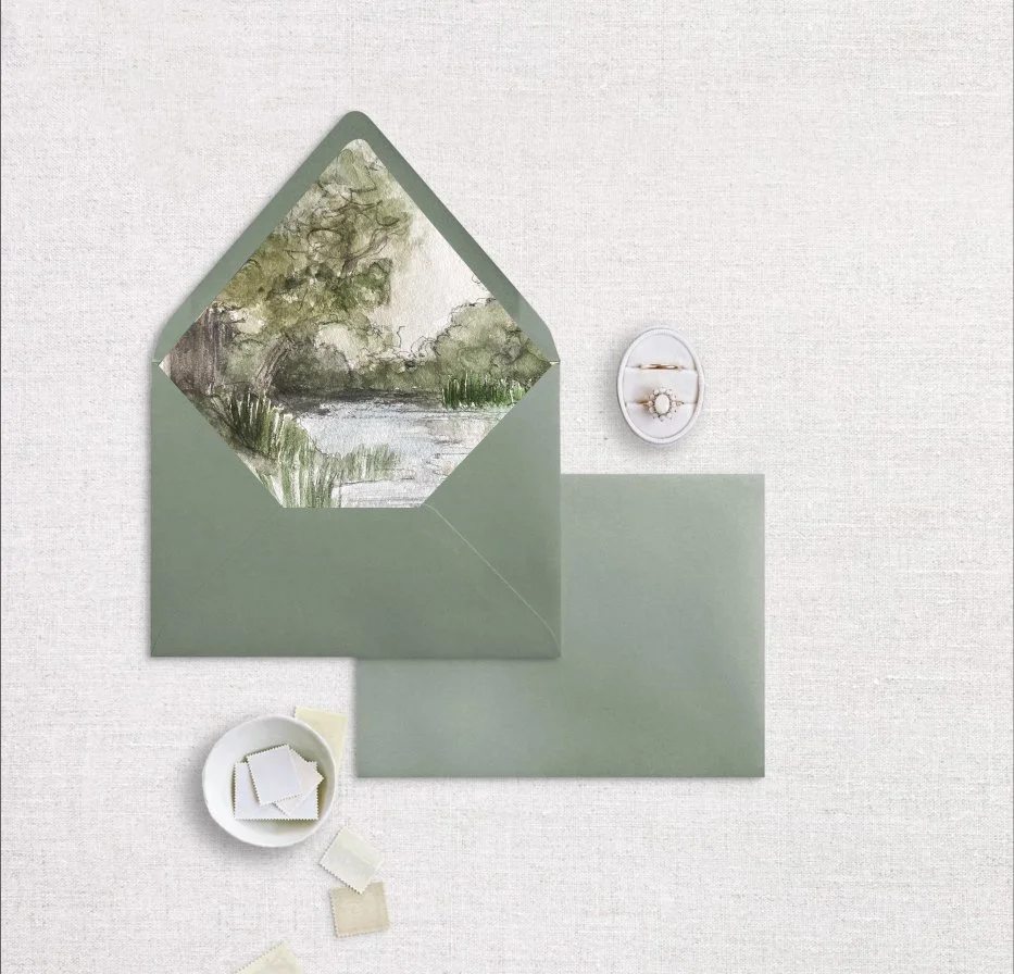 The perfect touch to elevate and customize your wedding invitations! These art liners are such a unique addition to your invitations. Envelope color shown is mid green.