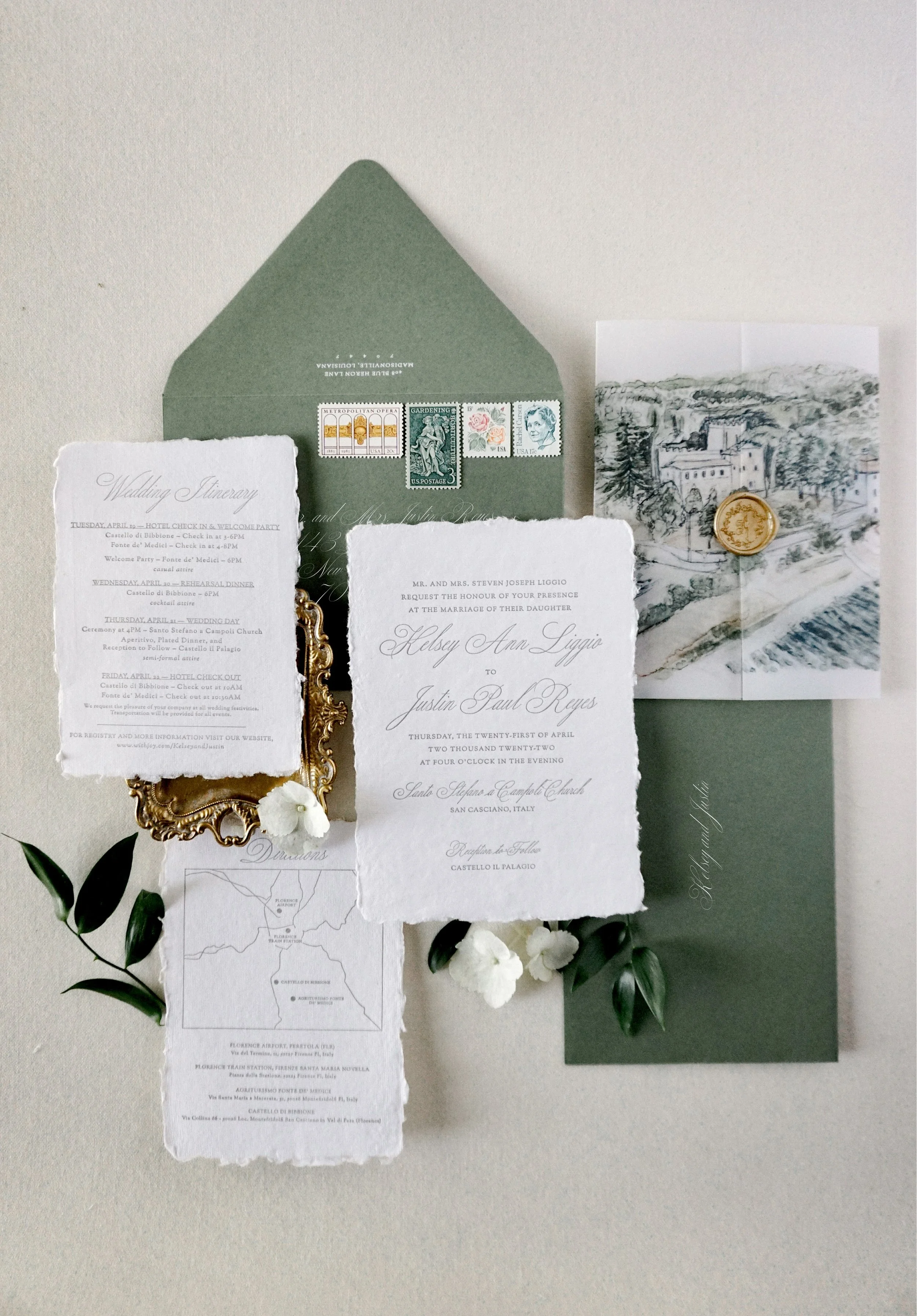 When old world meets Italy! This suite highlights the beautiful venue of Castello il Palagio β a Tuscan castle of the 13th century. It has a beautiful large garden that was used as inspiration for the design of this suite. Incorporating the aerial view of the venue on the vellum wrap leads your guests into the location of where they will be emerged in for this iconic wedding destination. Handmade paper, letterpress printing, vintage postage and the wax seals brings the old world feel.