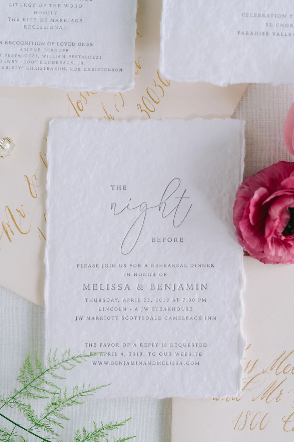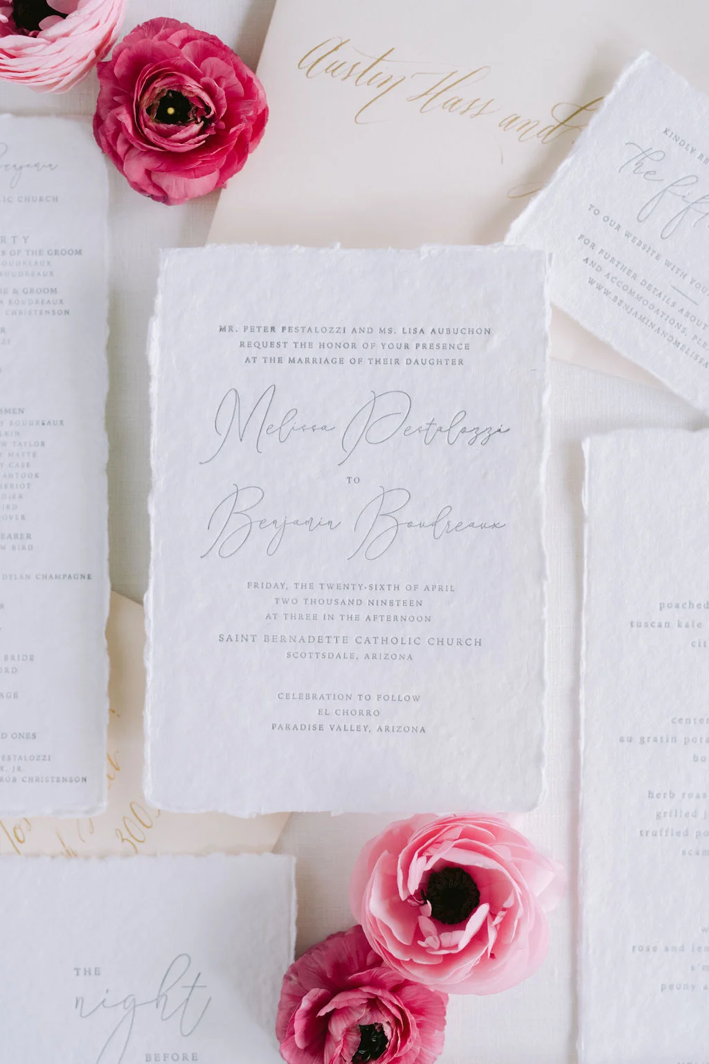 I don’t say this often, but this invitation suite was completely handmade, y’all! From the letterpress on double thick handmade paper to the calligraphy on the envelopes with custom vintage stamps to compliment the Arizona venue — this suite is a showstopper and definitely set the tone of this romantic outdoor Spring wedding!